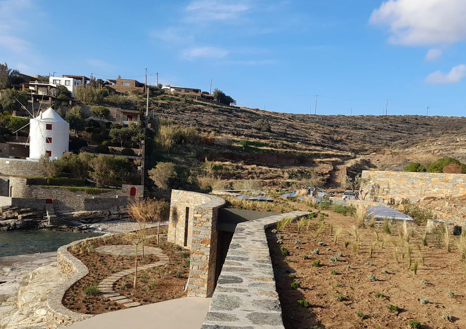 The planting scheme is a diverse and resilient combination of Mediterranean plants that enhance the natural beauty of the island and complement the architectural design. Mediterranean trees, such as Tamarix parviflora with its feathery foliage, adapted to seaside conditions and Acacia cyanophylla, with its distinctive bluegreen foliage add structural diversity to the planting scheme. Aromatic herbs, low-growing shrubs and resilient perennials that thrive in Kea’s climate work together to create a lush and vibrant underfoot experience, creating focal points through their carefully combination and enhancing the overall aesthetics. Native grasses, such as Hyparrhenia hirta, flowing from east to west, introduce a dynamic and textural element to the space. Their graceful movement in the breeze adds a touch of softness, creating a visual contrast against the studry structures of other plantings.